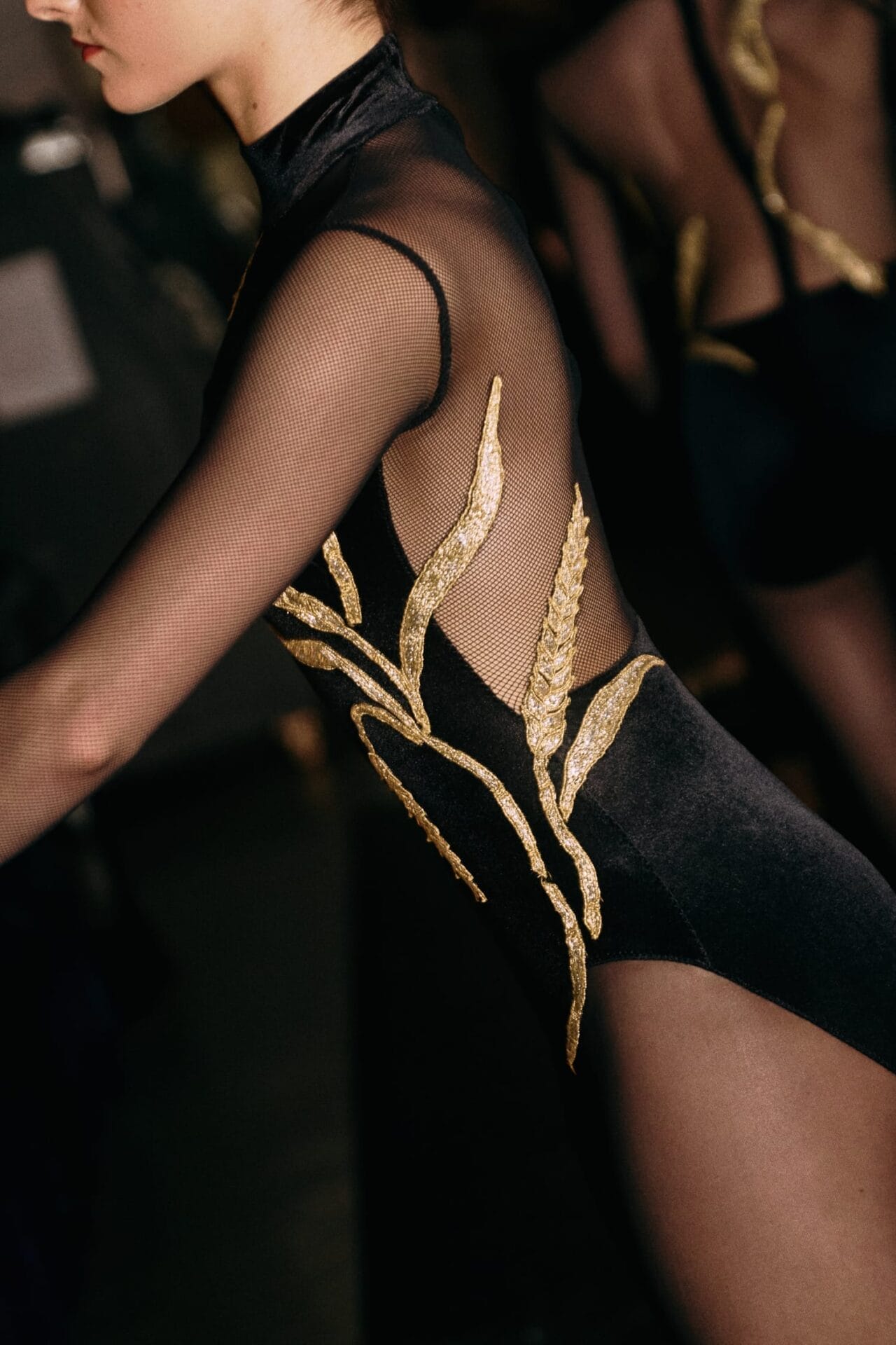 Inspired by the tension between fragility and resilience and themes of renewal, the costumes are black unitards adorned with refined golden embroidery of wheat. The performance also utilised an oversized coat with contrast piping that consumes the body. This enveloping silhouette allowed for Nicosia to stage a captivating sequence, in which two dancers under the coat–one with their top half exposed, the other with their legs emerging from beneath the material–performed a disjointed but synchronised movement. Eternal Rift’s choreography is complemented perfectly by the costume, lighting, and expert staging to become a deeply moving piece about transformation.
