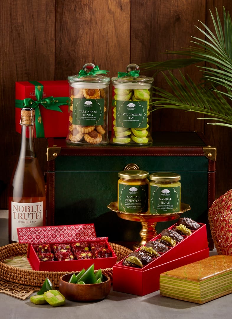 For those who prefer a more comprehensive selection, the Silaturahim Hamper is the perfect choice. This curated trunk is a treasure trove of delicious treats, including pineapple tart biscuits, pandan vanilla checkerboard cookies, dodol pandan, rose Turkish delights, pistachio & coffee dates, pandan layered cake, sambal tempoyak, sambal hijau, Noble Truth Grand Prestige cranberry rose sparkling tea, and premium English breakfast tea.