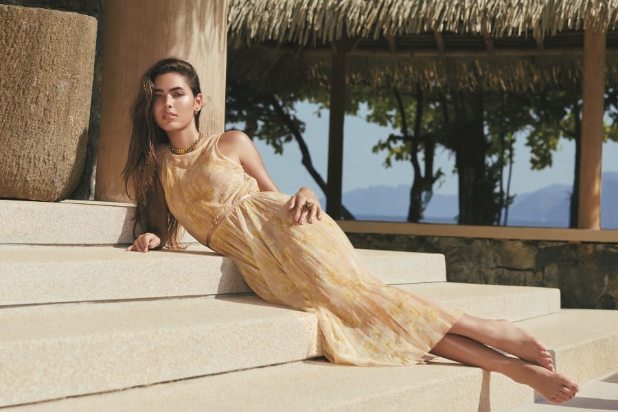 Dress; necklace; ring; and earrings; all from Dior