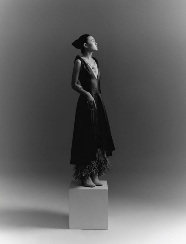 Dress, BOTTEGA VENETA. Tiffany HardWear bolt stud earring;Tiffany HardWear triple drop earring;Tiffany HardWear wrap necklace, all from TIFFANY & CO. Elise wears All Hours Foundation in LN7; and Rouge Pur Couture The Slim in 11 Ambiguous Beige, both from YSL BEAUTY.